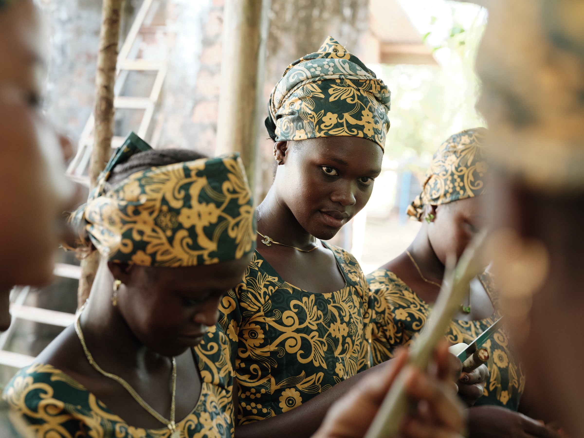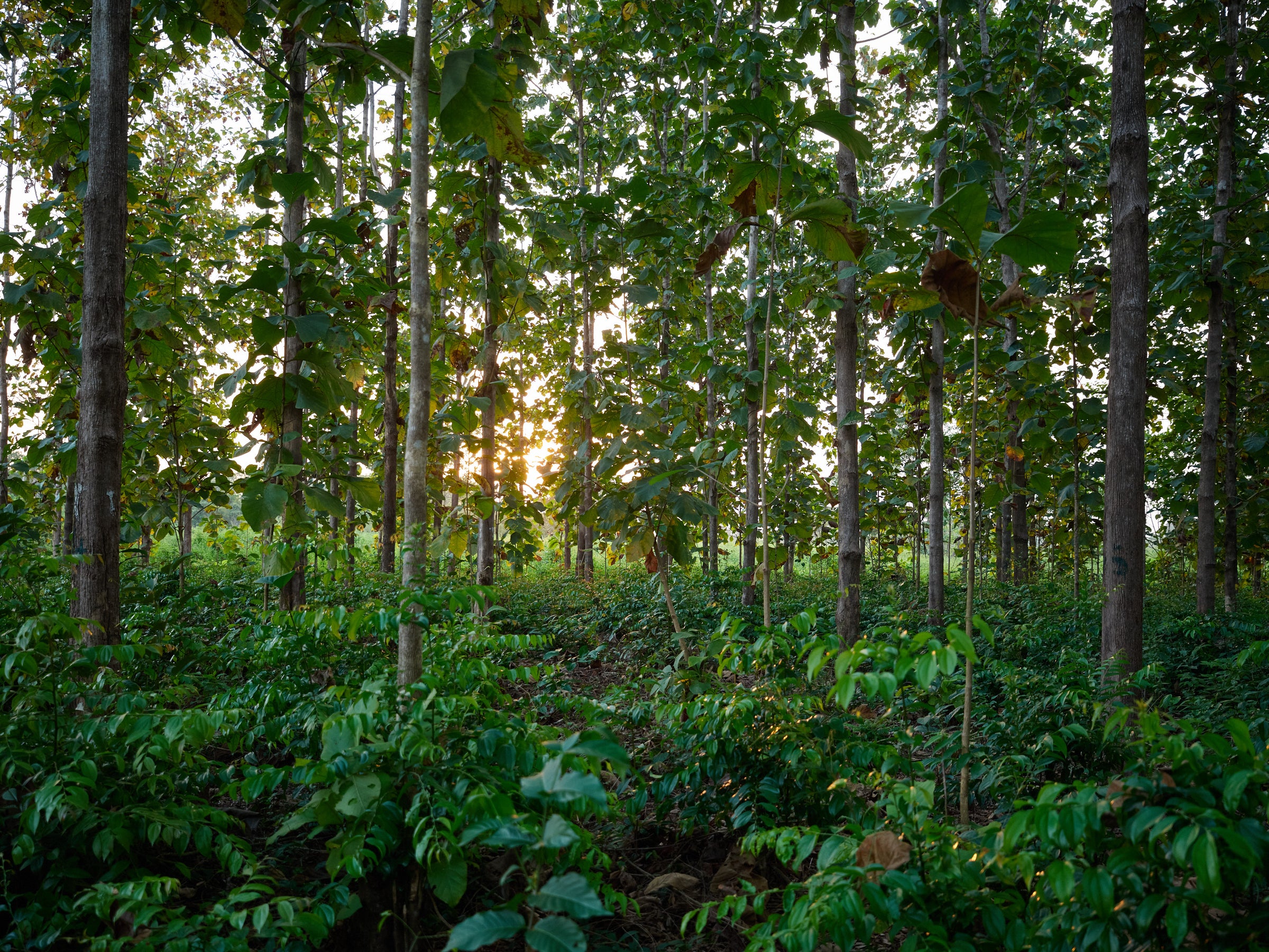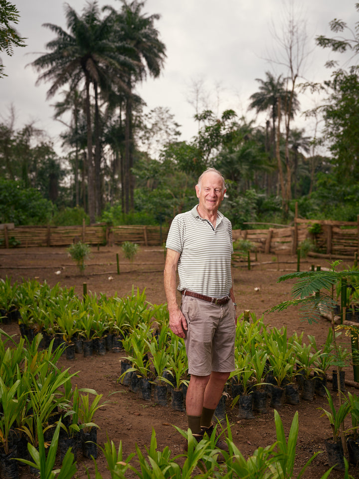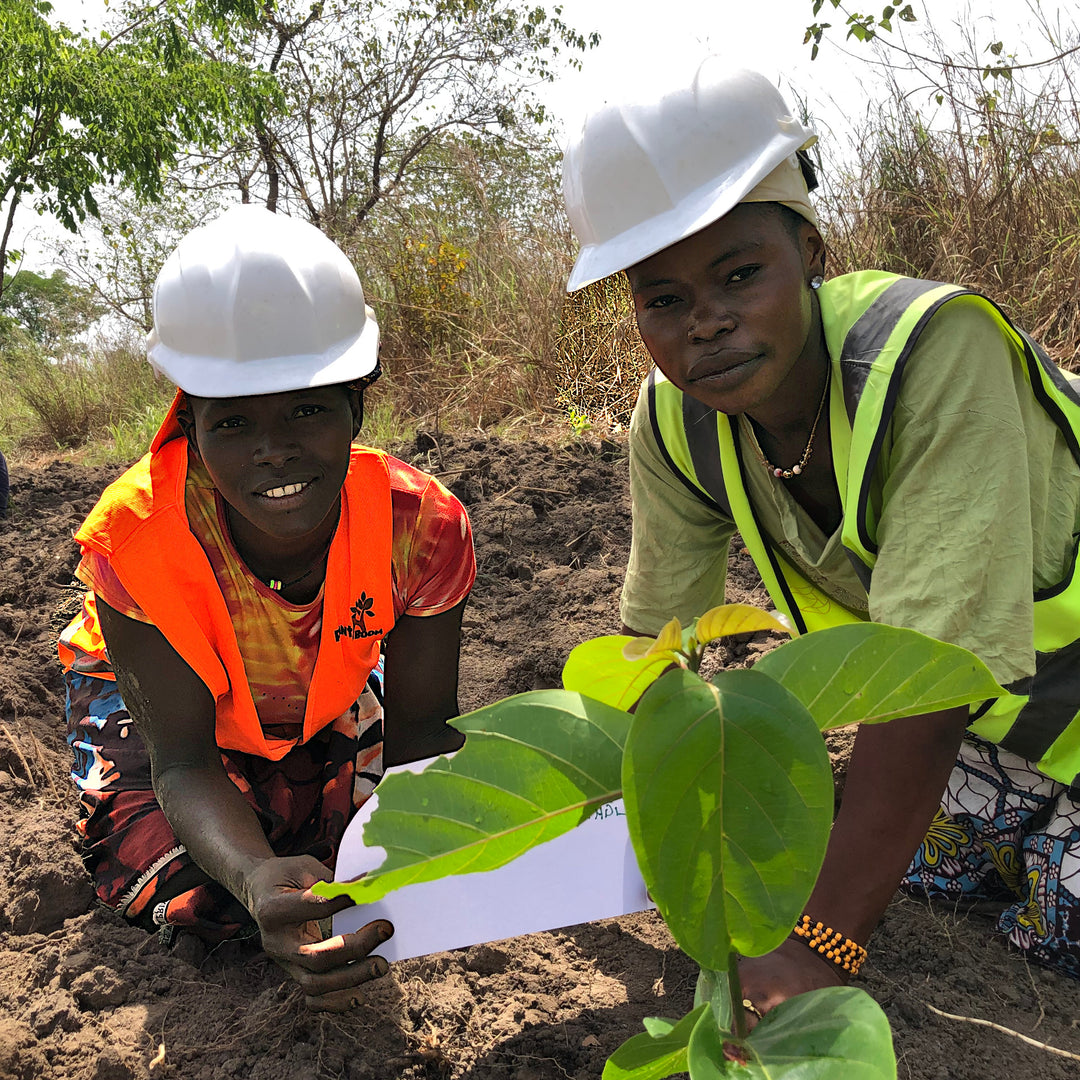 Steun vrouwen in Makombeh die voedsel verbouwen tussen jonge bomen. Elke boom helpt hun land, hun gezin en ons klimaat.